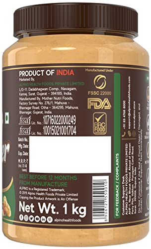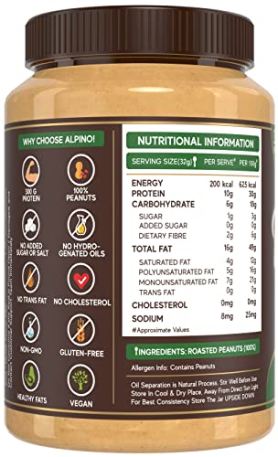 Alpino Natural Peanut Butter Crunch 2 KG | Unsweetened | 100% Roasted Peanuts | No Added Sugar, Salt or Hydrogenated Oils | High Protein Peanut Butter Crunchy | Gluten-Free | Vegan | 1 KG, Pack of 2