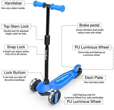 Baybee Kick Scooter, Age 3 – 10 is a smoothest and quietest kids scooter, with its lightweight design, 3 flashing wheels and lean to steer, makes riding a scooter fun and easy for kids to play with. Baybee Kids Scooter is equipped with 4 adjustable height handlebar so you can child can continue to use their scooter as they grow.