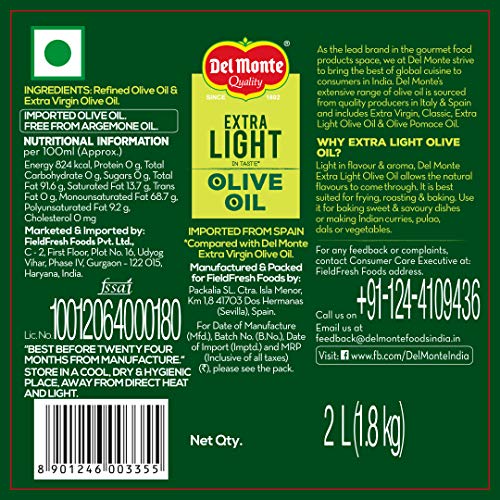 Del monte olive oil is 100 percent italian. Delmonte olive oil is distinguished by its colour and subtle taste is perfect for frying, sauting, roasting or baking absorbing the natural flavours of the food.