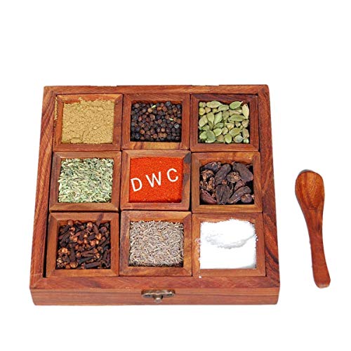 This sheesham wooden box with 9 sections and a spoon is great to store Indian spices This multipurpose utility box can also be used to store and serve refreshners, dry fruits and keep your knick knacks like jewellery, small items at one place
