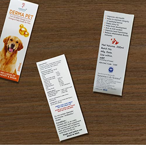 DERMAPET accommodates Fish Oil With Omega 3 and Omega 6 Fatty Acids, fortified with Vitamin A, Vitamin D and Vitamin E.