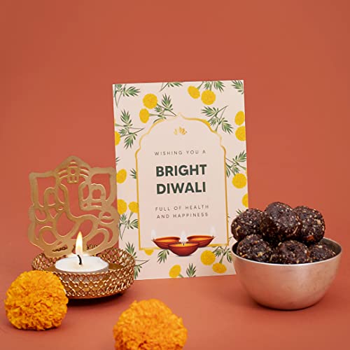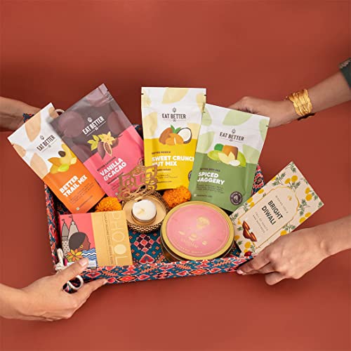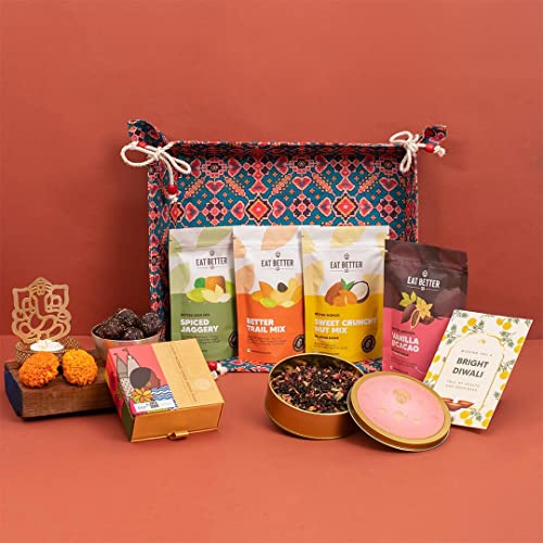 EAT BETTER CO – Premium Diwali Gift Hamper in a Patola Art Decorative Tray – Ten Items Combo – Premium Nut Mixes, Healthy Laddoos, Rose Tea in Golden Tin by Vahdam, Incense Cones with Rose Petals, Ganesh Diya made of brass, Candle and Diwali Greeting Card