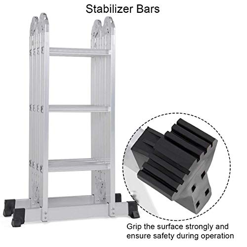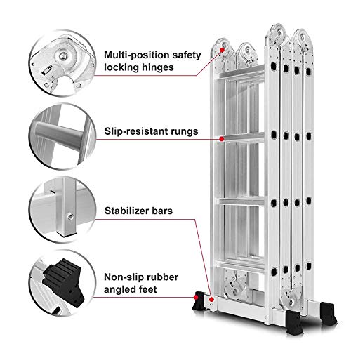 Primary Material: Heavy-duty 6063 T5 grade aluminum construction; square rungs and supporting tubes, make this folding ladder stable and durable; meets EN131 standard and maximum load capacity is 150 kgs. Aluminium Thickness is 1.5 mm And Height between rungs is 28 cm. This Aluminium Ladder have 12 Step (4 x 3).