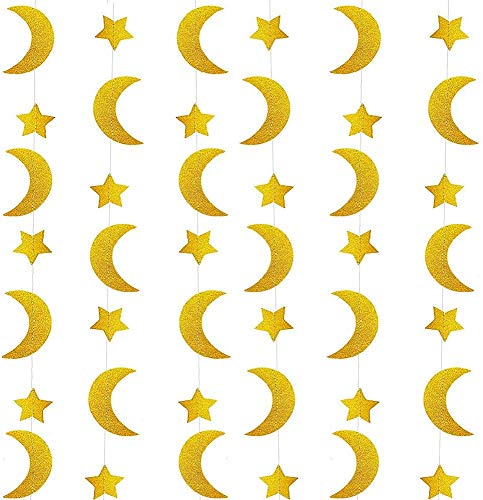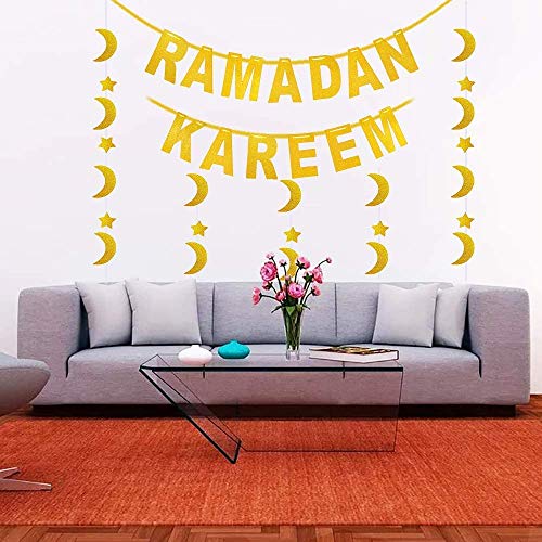 Festiko Ramadan Decorations for Home Ramadan Kareem Banner with Gold Glitter Moon Stars Garland for Eid Mubarak Decor