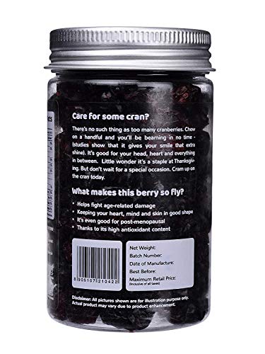 Cranberries contain high levels vitamins c and k, calcium, manganese, fibre and antioxidants. Consuming cranberries on a regular basis can prove to be good for the eyes, help prevent urinary tract infections, brighten your smile. Packed in induction sealed, air tight pet jars for freshness, easy portability and storage. For optimum freshness, refrigerate after opening.