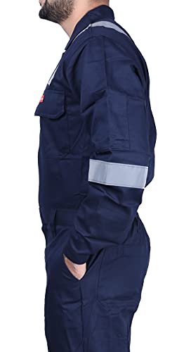 FRENCH TERRAIN® MEN’S COTTON INDUSTRIAL BOILER SUIT WORK WEAR COVERALL WITH REFLECTIVE TAPE, 210 GSM, 40 – L, NAVY BLUE.