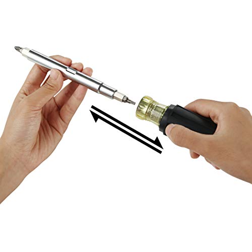 This versatile 8-in-1 tool has everything the professional needs. The integrated screwdriver shaft holds 8 popular tips and converts to 3 nut driver sizes. The blades are interchangeable for quick and easy switch out.
