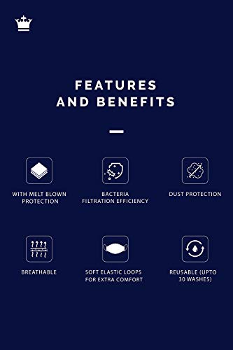 This is made of cotton with antimicrobial finish, 3 layer knit mask, melt blown material for high level of filtration, breathable, reusable till mask lasts, soft elastic loops for extra comfort, Also wear each mask for 6 hours only, isolate mask after used, wash separately at 40 C. Certification: tested with government approved laboratory in accordance to astm feel 2101 with high bacteria filtration efficiency.