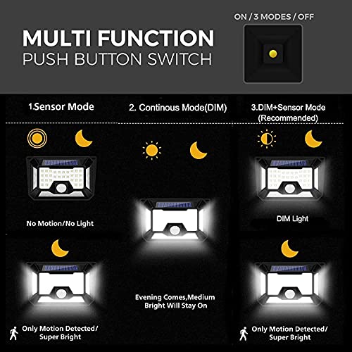 Equipped with a strong PIR motion sensor, 4-side Solar Light works in 3 different modes to cope with different usage scenarios. This adjustable feature perfectly fit for Home, garden, front door, back yard, garage,