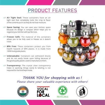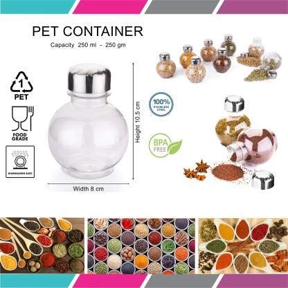 The jars are made by food grade material that holds up to 80 ml of spices, grams, dry fruits, Pulses etc.