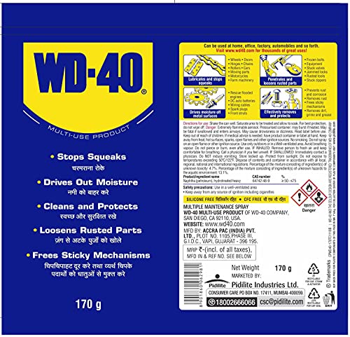 Pidilite WD-40, Multipurpose Spray, Lubricant, Rust Remover, Squeak Noise Remover, Stain Remover, and Cleaning Agent, 170g