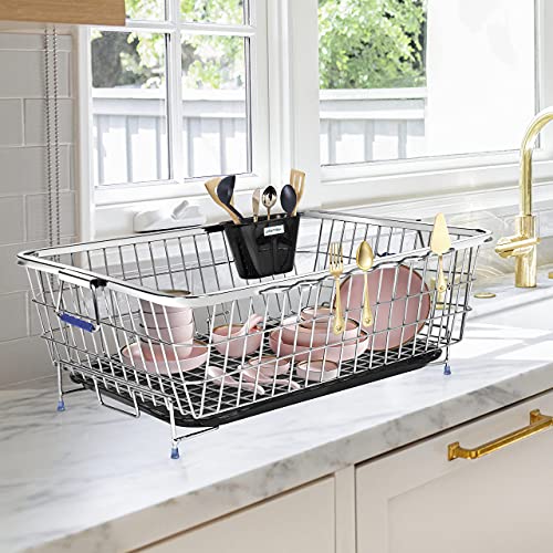 The mirror end by nickel-chrome coating on this dish drying rack retains it rustproof and corrosion free for at all times. It has rubber fittings in its legs that makes our utensil rack utterly scratch free. Plastic coated handles provide you with grip for dealing with/carrying the rack.