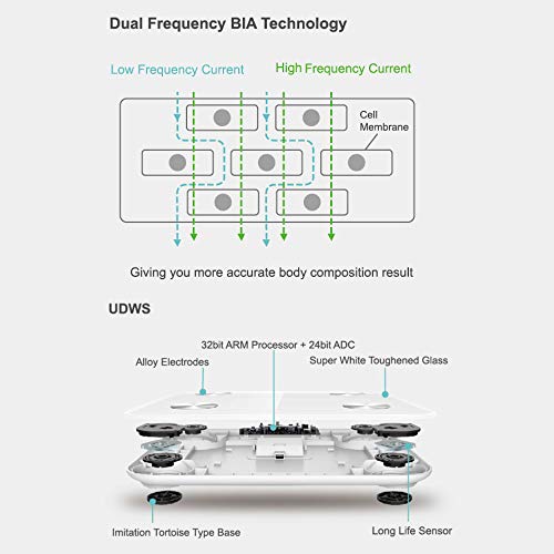 Measures 13 key body composition: Weight, BMI, body fat, fat-free body weight, subcutaneous fat, visceral fat, body water, skeletal muscle, muscle mass, bone mass, protein, BMR, metabolic age