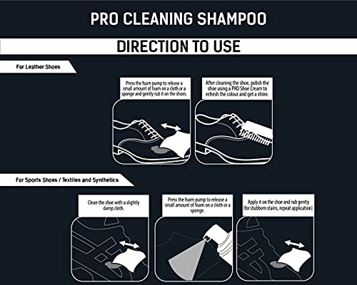 DIRECTIONS TO USE: Press foam pump to release the foam on a cloth and gently rub it on the shoes and distribute it evenly onto the shoes. leave for few seconds and gently rub it with a cloth or application brush ti clean the surface. Remove the excess shampoo from a cloth.