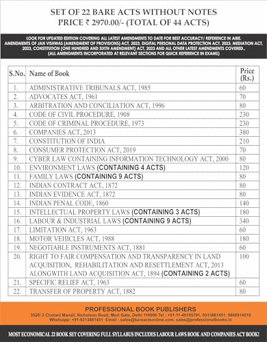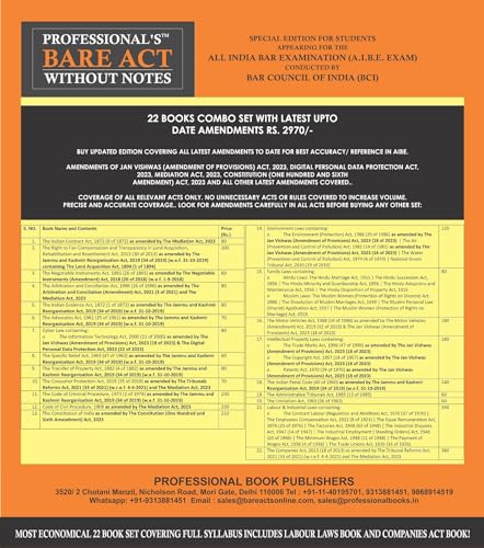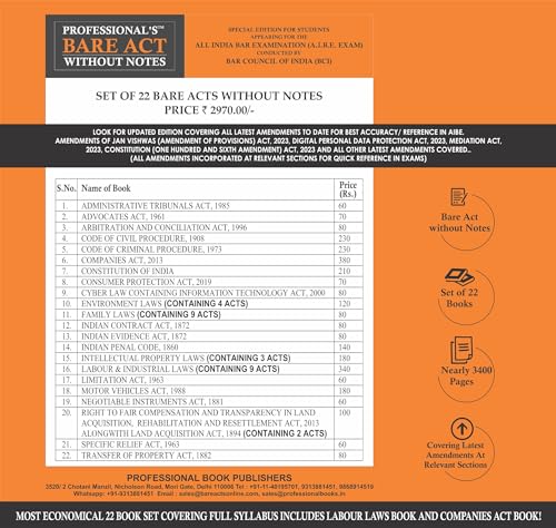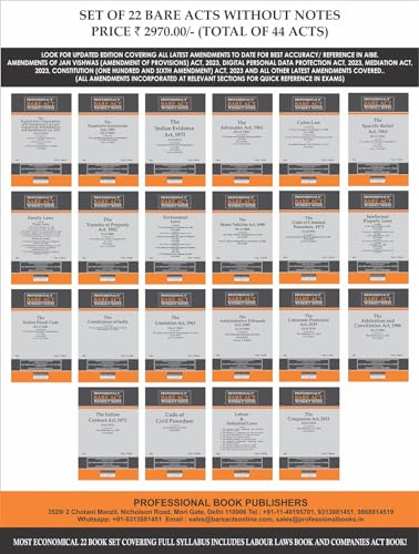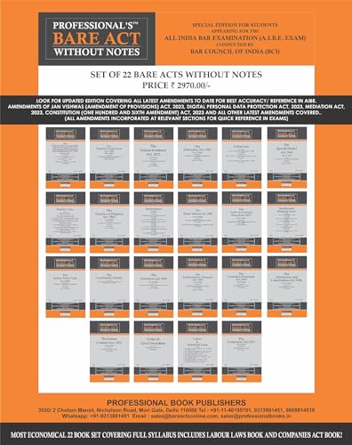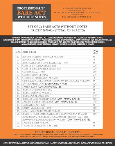 PROFESSIONAL’S AIBE Exam 22 book Bare Acts set without Notes, Complete Set of 22 Books Combo as per Bar Council of India Guidelines covering Latest up to date amendments- Full Syllabus Economy Edition