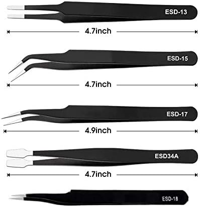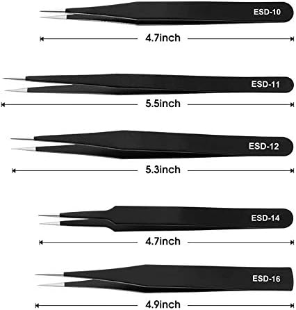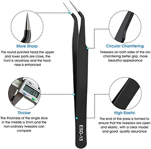 10 PCS ESD TWEEZERS KIT: 10 in 1 ESD tweezers kit has 10 pcs different tweezers to meet your different needs. 6 pointed tweezers, 2 curved tweezers, 1 flat round tip tweezer, 1 square tip tweezer. And all of bit is through strict quality testing