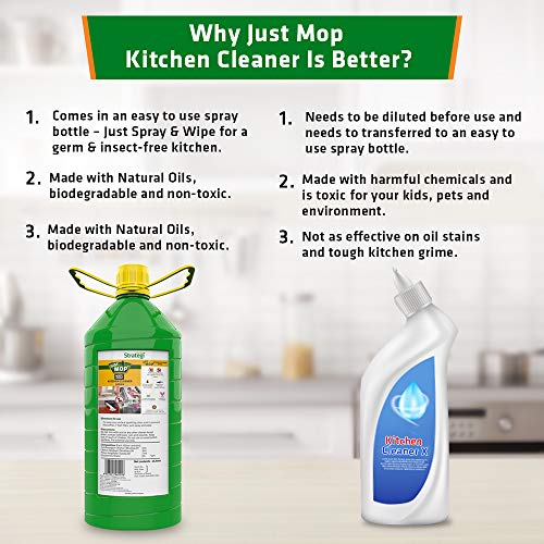 Hard on Germs & Gentle on Environment: Just Mop is made to help clean your kitchen and keep it free from dirt, grime, insects and bacteria. While being harsh on dirt & germs, it is biodegradable i.e. breaks down into harmless components when disposed.