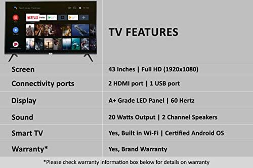 Smart TV Features: Buitl-in Wifi | AndroidO (Certified by Google) |Dual Core MALI 470 Graphics Processor