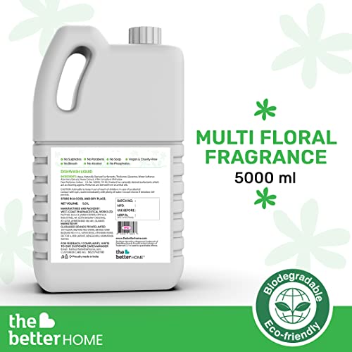 The Better Home Family Safe Dish Washing Liquid | Non Toxic, Eco friendly & Biodegradable | Non Corrosive Bio Active Grease Removal for Zero Toxic Residue | Floral Fragrance | 5 L