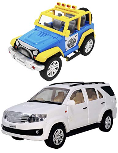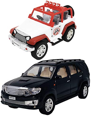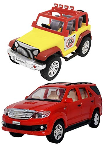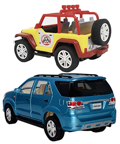 Toyify Pack of 2 Small Size Plastic Made Indian Vehicle Miniature Scale Model Fortune SUV Car + Mini Open Top Jeep Toys for Kids | Made in India Toys | Safe Quality Toys | Color May Vary [ 2 Combo Offer Small Size Toys ]