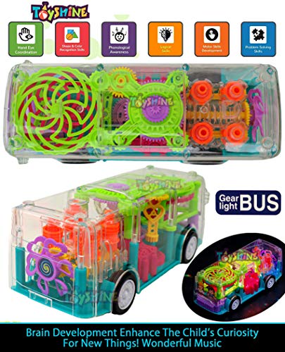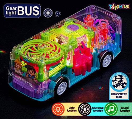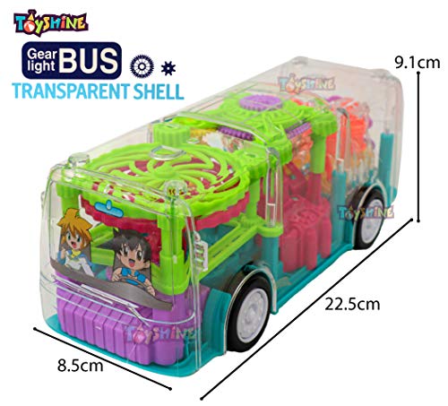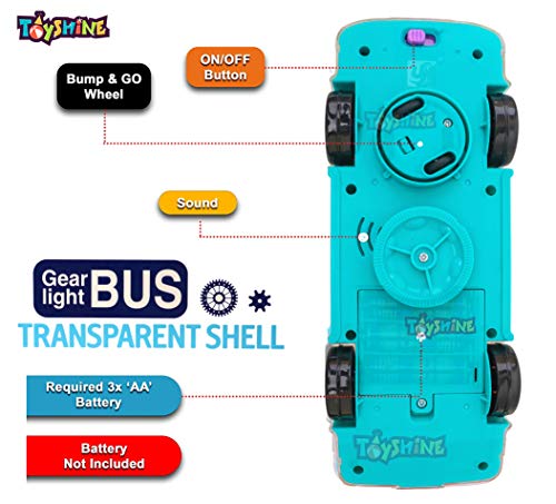 Transparent Concept Racing Bus with 3D Flashing Lights Bus with functions: Forward/ Backward, Stop. Unique Design – Transparent design, one Can see the gear inside, helps the kids to know mechanical concept.