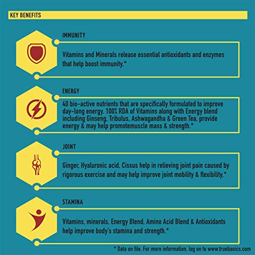Energy Blend: TrueBasics Multivitamin for Sports (From the house of Healthkart) is enriched with Tribulus, Ginseng, Ashwagnadha, Green Tea that provides energy & may help promote muscle mass & strength