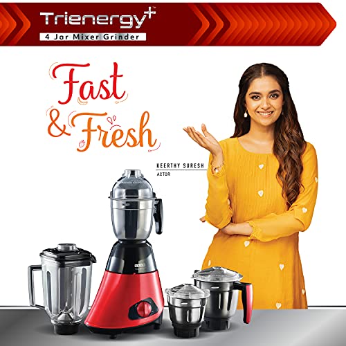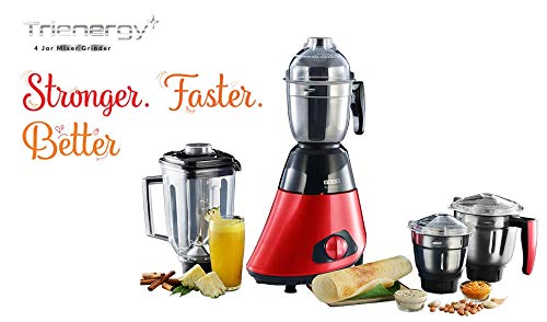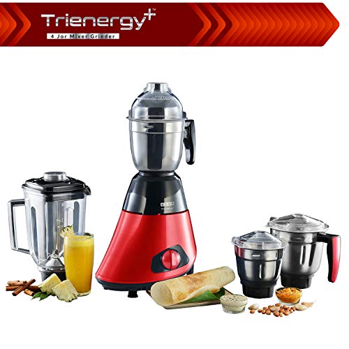 Usha Trienergy Plus 800 Watt Mixer Grinder with Copper Motor, Sq. Formed Quadri Movement Blender Jar and, 6 Fin Whirlwind Meals Grade Blade, 4 Jars (Crimson)