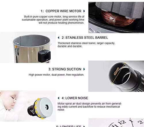 Technical Description Power : 1500w Cooling system:Rccycle Vacuum :2000mmH20 Capacity :20L Height: 57cm Diameter:30cm Air Flow:53L/S Function : Wet/Dry Voltage: 220v-240v 50/60HZ Cable:5M Packing size: 43*43*53.5cm Packages:1 pc /ctn Weight: 10.3kg
