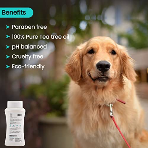 Tea Tree Oil acts as an excellent flea-repellent, deodorizer and skin soother for your pet. Provides an antibacterial, antipruritic and anti-inflammatory effect on your dog’s coat
