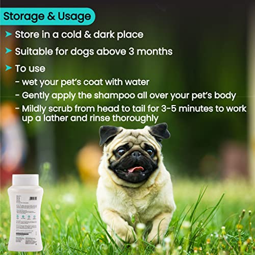 Suitable for dogs above 3 months of age. To use, wet your pet’s coat with water, gently apply the shampoo all over your pet’s body, mildly scrub from head to tail for 3-5 minutes to work up a lather and rinse thoroughly