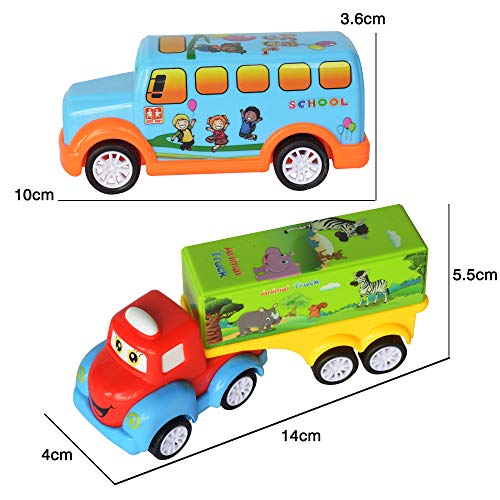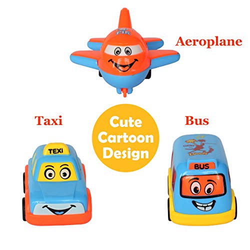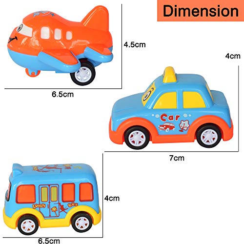AWESOME FUN & EASY OPERATION -Simply pull back & let it go.It will be great fun playing with mini model cute cartoon designs of 5 different vehicles-Aeroplane,Taxi,Bus and Big & Small Truck.