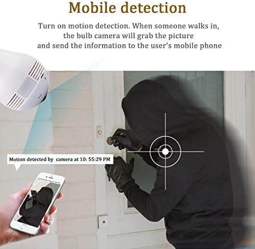 Features: Built in 360-degree fisheye lens will provide you a super wide viewing angle. See your entire home with no blind spots. Looks just like a lightbulb, making it easier than ever to hide the camera in any non-dimmable light bulb socket. Motion Alerts: No matter where you are, the bulb camera keeps you up-to-date on what?s happening at home with motion detection alerts. Intelligent LED brightness control enables it to adjust the light of the environment. AMAZON.COM The bulb camera shows amazing detail in its well designed bulb style and can record and live stream in Full 1080P High Definition. All you need is a smartphone and a quick Wi-Fi setup via iOS or Android or smartphone APP. You can view HD video anytime from your smartphone from any part of the world. ˜ Specification: Size: 5.2 * 6.6 * 3.4 CM – Weight: 0.29 lb. Power supply: AC 100~240V Camera lens: 360?panoramic perspective 1/3″ fisheye Lens Field of vision: horizontal 185?/ vertical 185? Video code: H.264 – Video storage: in TF memory card(up to 128G), TF card not included Frame rate: 25fps real time WIFI standard: IEEE802.11B/G/N, Wi-Fi Frequency:2.4 Operating System on Cellphone: Support iOS 8.0 and above / Android 4.1 and above Please note: the TF card is not included in the camera and 5G Wi-Fi is not supported. What?s in the box: 1 X Bulb Camera 1 x User manual 1 x Light bulb socket extender SECURE YOUR RESIDENCE AND THE LOVED ONES! CLICK ADD TO CART NOW.