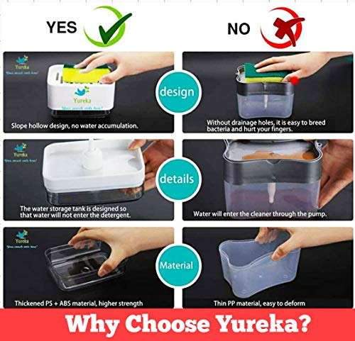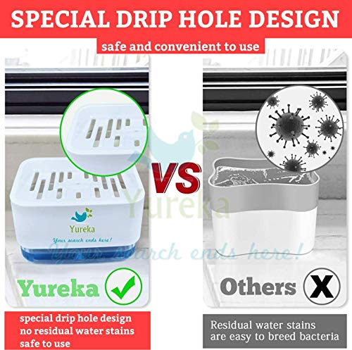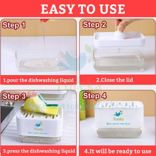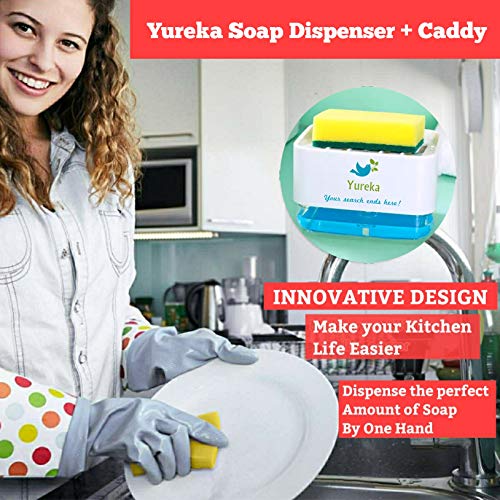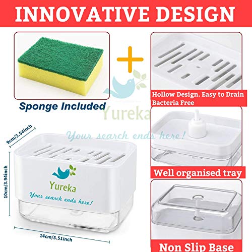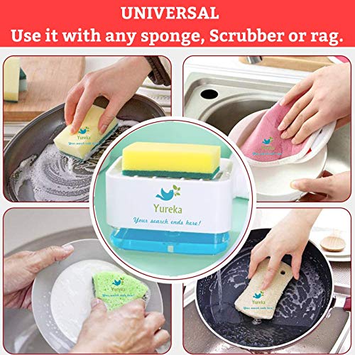 Bring an end to messy soap bottles on your countertop with the YUREKA soap dispensing sponge holder. Get soap on demand with an easy, one-handed press. The ventilated, elevated Holder promotes quick drying, while the drip tray catches excess water from sponges. With an internal soap cap that prevents water from mixing into dish soap, and a clear body that shows when it’s time for a refill. The Holder comes apart for thorough cleaning. Sink dispenser with attached caddy holds sponges, scrubbers, rags, scouring pads in one convenient place while keeping water off of kitchen counters. Fill it up your favorite dish soap, then use the included sponge to press down on the pump, which dispenses the perfect amount of dish soap up onto the sponge.Cleaning dishes is about to get a whole lot faster with this Soap Pump & Sponge Caddy