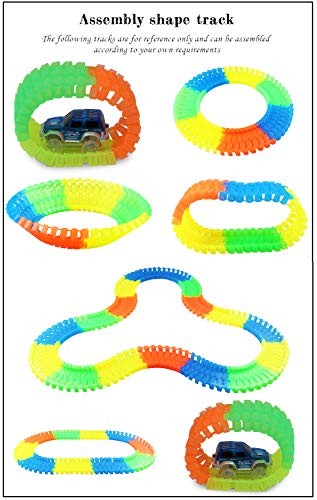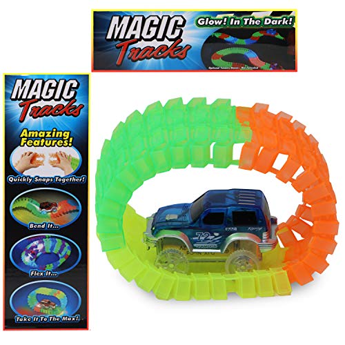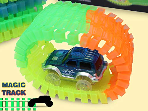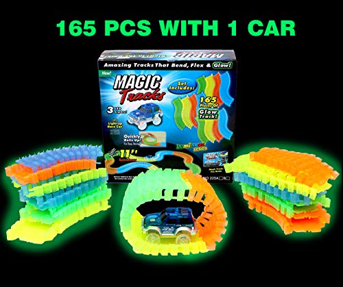The neon tracks glow in the dark! Race car has 5 built-in LED lights that glow as they speed around the track. Turn off the lights and Wow! It Glows Like Magic.The easy-to-put-together format enables young racing fans to get creative and construct their perfect speedway track in secondsWith 165 pieces of track and racing car with flashing LED lights, playtime will surely be a blast! Track pieces easily snap into place. Once configured, bend and flex the track into hundreds of different shapes.