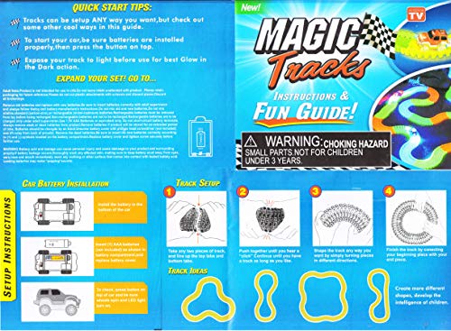 The neon tracks glow in the dark! The race car has 5 built-in LED lights that glow as they speed around the track. Turn off the lights and Wow! It Glows Like Magic. The easy-to-put-together format enables young racing fans to get creative and construct their perfect speedway track in seconds with 165 pieces of track and racing car with flashing LED lights, playtime will surely be a blast! Track pieces easily snap into place. Once configured, bend and flex the track into hundreds of different shapes.